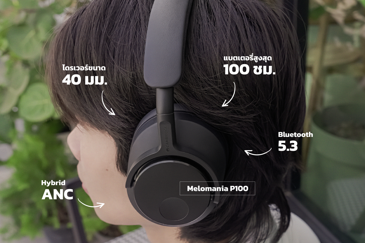 Melomania P100 ดีไซน์แบบครอบหู (Over-Ear) มีความเรียบหรูผสมกับความทันสมัย ที่ครอบหูเมมโมรี่โฟมที่มีความยืดหยุ่น และแถบคาดศีรษะหนังวีแกนนุ่มช่วยให้สวมใส่สบายได้ตลอดทั้งวัน ไดรเวอร์คอมโพสิตสามชั้นขนาด 40 มม. เชื่อมต่อแบบไร้สายผ่านบลูทูธ 5.3 และเชื่อมต่อแบบมีสายผ่านสาย AUX 3.5 มม. ระบบตัดเสียงรบกวน Hybrid ANC และแบตเตอรี่ใช้งานสูงสุด 100 ชม. (รองรับ Fast Charge ชาร์จ 5 น. ใช้งานได้ 2.4 ชม. เมื่อปิดโหมด ANC)