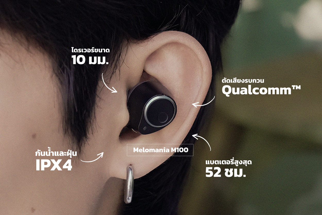 Melomania M100 ดีไซน์แบบอินเอียร์ (In-Ear) มาพร้อมจุกหูฟังให้เลือกเปลี่ยนถึง 5 คู่ เป็นเมมโมรี่โฟมคุณภาพพรีเมียม 2 คู่ และ เป็นซิลิโคนอีก 3 คู่ ไดรเวอร์แม่เหล็กนีโอไดเมียมรีไซเคิลขนาด 10 มม. เชื่อมต่อแบบไร้สายผ่านบลูทูธ 5.3 ระบบตัดเสียงรบกวน Qualcomm™ มาตรการกันน้ำ IPX4 และแบตเตอรี่ใช้งานสูงสุด 52 ชม. (รองรับ Fast Charge ชาร์จ 10 น. ใช้งานได้ 1.5 ชม. เมื่อเปิดโหมด ANC และ ใช้งานได้ 2.4 ชม. เมื่อปิดโหมด ANC)